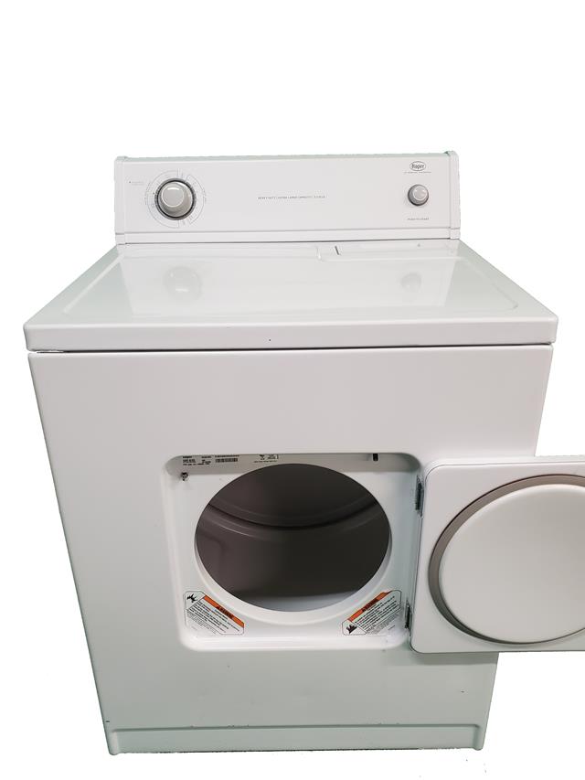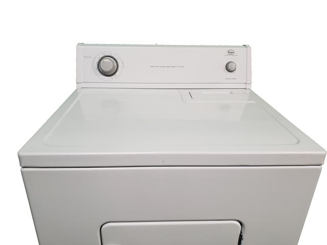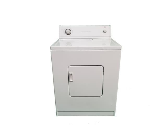 Roper dryer with flat back design. Roper is made by the Whirlpool company, and is one of their entry level brands, with the same parts as Whirlpool and some Maytag. This dryer has a flat back design which allows it to fit into spaces that need less depth. This dryer measures in at a little less than 26” in depth. $250, 1 year warranty.