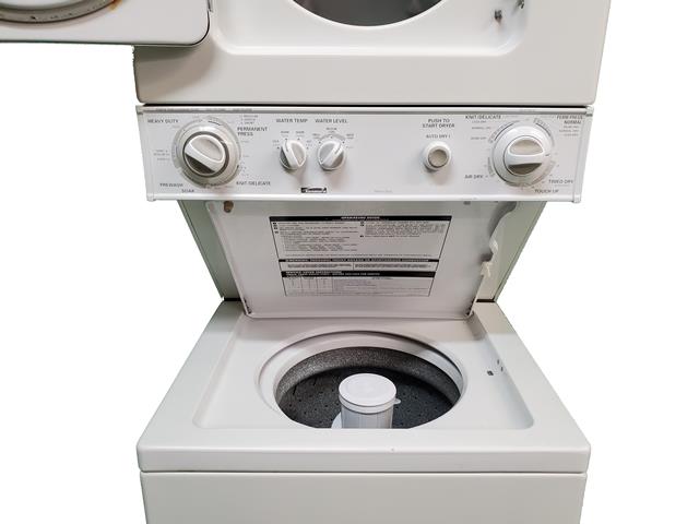 Whirlpool made Kenmore washer and dryer stack unit, with agitator washer. This is the Whirlpool direct drive washer style, which in Sargent’s opinion, is one of the best washer designs to ever be made. The washer and dryer have been completely rebuilt, with the washer getting the standard rebuild of new coupler, clutch and pump, and the dryer getting a new belt and other broken items. This is an apartment sized stack unit, with a 24” inch wide cabinet, but has a large tub for how small its overall size is. $550, 1 year warranty.